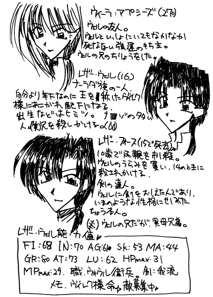 | リューン: | 実は生まれはスィスニアではなくウォウルなのだな、これが。父親はヴィレク少年の祖父、詰まり先々代のウォウル邑宰に仕えていたのだ。結構な寵愛を受けていたらしいが……まあ、成り上がり者だったからな、それにまわりを立てるということを知らないようで、敵が多かったらしい。それで父が死んでしまったわけだから、残された遺族はいよいよ風当たりが強くなったわけだ。仕方がないのでスィスニアの親戚を頼って来て、俺は当時の邑宰の娘、詰まりクーデター前の邑宰であるシルキーヌに児小姓として仕えた。まあ遊び相手みたいなものだな。それから各地を放浪して色々とやった後、戻ってきてクーデター。そして、現在に至ると……。 |