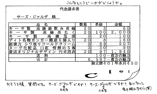 ■ お客様がいるから幸せです♥ 【作者:浅葱 翔】 「シーちゃんっ、一大事ですよ!シーちゃん。注文がきてます。注文っ。しかもこんっなに。」 朝、出勤したばかりのティエラの声がシェルセラヴの眠りを妨げた。お店の二階。一般の人は立入り禁止である。特にこのお部屋は御主人様以外何人も立入り禁止区域である。が、ティエラはお仕事があるため、入る権利がある。 「なによう。まだ店開ける時間じゃないでしょ。もうちょっと寝かせて。」 ティエラは、部屋の窓とカーテンを全開にして、また寝ようとしたシェルセラヴの顔の前で、ポストから取ってきた封書の中身をヒラヒラさせる。 「シーちゃん、見てください。これ。」 「何?」 「だから、注文なんですってば。」 「ちゅうもん?…………注文!?」 その言葉の意味を理解したところで、シェルセラヴは漸く目が覚めたようだった。ティエラからそれを受け取って、目を通す。 「カルナ・シェルセラヴ・ファンシーショップ様…………。ふむふむ。」 横でティエラが目を輝かせている。 「ね、ね、すごいですよね。注文なんて初めてですよ。……? シーちゃん? どうしたんですか? 嬉しくないんですか?それともまだ頭寝てるんですか?」 だんだん無表情になっていくシェルセラヴの顔をティエラは心配そうに覗った。 「…………ティーエラちゃーん。うちのお店って何のお店?」 「今更何言ってるんですか。『何でも屋さん』でしょう。」 ティエラは快く自信を持って笑顔でもって答えてくれた。その答えを聞いた瞬間、シェルセラヴは考え込んでしまった。 …………そうだったかしら?確か当初はブティックのつもりで始めたんだったと思ったんだけど。どこで路線が切り替わったのかしら。 「あのね、うちはね。置いてあるものは基本的に全部私の手作りなの。知ってるわよね?」 「もちろんです。あんなものシーちゃん以外に作れません。」 あんなもの……? シェルセラヴにはそれの意味するものがどれにあたるか分からなかった。 「まあいいわ。……だからね、ここに書いてあるような生物とかも置いてないのよね。どうしよっか。」 「シーちゃん、それはまずいです。」 「そう?私は結構好きだけど。でも店によってちょっとずつ味違うのよね。『風鈴堂』のが一番おいしいと思うわ。甘さ控えめだし。」 「お饅頭のことじゃありません。お客様に商品をお届け出来ないなんて、このお店の信用に関わるんですよ。」 「それは困ったわ。」 シェルセラヴとティエラは二人とも、大変困ったという表情をしていたが、本当にそう思っているのはティエラのみであろう。 シェルセラヴは再び注文票に目を落とす。何にしても量が量だし……と眺めていると、料金請求先のところでその目が止まった。 ……これはこれはご丁寧に。 「ティエラ、二人で考えていてもしょうがないし、これは私がなんとかするわ。さ、下へ行ってお店を開ける準備をしてて。私も着替えてすぐ行くから。」 「はい。」 ティエラは大変良い返事をすると、部屋から一度出て、出てから扉の隙間から顔を覗かせた。 「ちゃんと来るんですよ。」 釘を刺していくのは忘れなかったようだ。シェルセラヴの性格を結構把握出来ている。しかし、結構出来ているだけで、ちゃんと理解は出来ていないようだ。それほど長い付き合いではないので、仕方のないことであろう。 シェルセラヴはティエラが出ていくのを見届けてから、注文票をもう一度眺めた。 問題は、このサーズ・ジァルザという男である。一応名前は知っている。うちの兄(ということは認めたくないが)に、勝るとも劣らぬ性格の悪さという。 眉目秀麗容姿端麗頭脳明晰って、自分で書いたんならそれもうなずける。 しかしそうは考えてもやはり、ここまで挑戦的に書かれては行かないわけにはいかないでしょう、と思うところがシェルセラヴである。 キーサのもなんとかなるわ。全部の品を耳を揃えて、届けて差し上げましょう。その届けた足で、代金請求に参りますわ。 代金……この方法だと送料って私の旅費になるのかしら。でも、キーサからのもあるし。結構高くなりそう……。だけど旅費って浮かせようと思えば結構どうとでもなるのよね。どうしよっかな。この人お金持ってそうだし平気かな。 顔見てから決めようかなどと考えていることが、ティエラに知れたら怒られることは必至であった。 お饅頭はやっぱり『風鈴堂』さんで、湯飲みと急須は『暇月』さん、茶たくは『桐好』さんにお願いして、クリームと口紅はそうだな、『タケモトキヨツ』さんがいいかな。浴衣20着も無いから作んなきゃだし、忙しいわ。ラルアークにも飛んでもらわなくちゃ。 一応の行動計画を立てながら、身支度を手早く済ませる。 シェルセラヴはこの店を始める前は、方々を旅して廻っていたので、どこに良い店があるかも結構把握している。もっともかなりの偏った趣味で選んでいることは否めないが、もう常連となっている