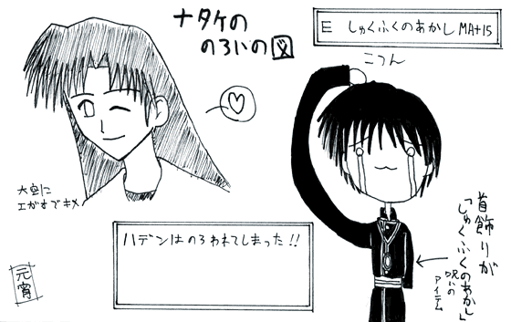 ■ ナーラダ戦記外伝 覇伝マキシマム 第弐幕 ハデン先生 【作者:元宵】 〜前回までのあらすじ〜 一身上の都合によりウォウル王佐をクビになったクラウ・ハデン(何時の話だ)。彼は愛するライル・ナタケの居るスウィズに出戻りとなり、彼女の為に、粉骨砕身、尽忠報邑、滅私奉公、草を噛み泥水を啜る思いで尽くすもライル社はバブルが弾けて潰れ、しかも最愛のナタケは死んでしまう。ヤケになったハデンは自殺を図るも死にきれず、精神に若干の変調を来したまま(アレで「若干」か)紆余曲折を経て黒竜旗軍の所に出現した。さて……。 1:黒竜旗軍にて 独立暦402年人の月下旬。 「ついたか………」 ハデンとハクユウは竜爪関の地で黒竜旗軍と合流した。 ハデンと対面した黒竜旗軍の面々は、彼を知る者はその変わり様に、会ったことの無い者は想像していた人となりとのあまりの差異に心中驚いていた。尤も、彼が変わってしまった理由については容易に想像がついていたので、決して口に出そうとはしなかったが。 「クラウ・ハデン殿、貴殿の参入を心から歓迎します」 長官のシリルはハデンの手を取って心からそう言った。黒竜旗軍には肉体派……もとい、一騎当千の勇将は居るが軍事面で頭を使う者は長官ぐらいしか居ない。そうでなくとも、ただでさえ人材が欲しい今日この頃。ハデンの参入が嬉しくないわけがない。 「あはは、よろしくお願いします」 笑顔で返すハデン。彼について「酷薄」「無愛想」等々の評判しか聞いてなかったシーランやスィスニア組は驚きを隠せない。いや、もっと驚いていたのは他ならぬスウィズ組だ。あんな爽やかな突顔はナタケにしか見せなかった筈。 (何か企んでるわよ) 小声で囁きディグ・カイルにたしなめられていたのはライル・カミナであったという。 黒竜旗軍に来てハデンに与えられた初仕事、それは。 「初めまして、クラウ・ハデン。私がヴェリア・ユーリィじゃ。シリルから話は聞いておろう。早速気功術法を教えてくれい」 (……もしかして、子守り……?) ハデンよ、それは余りにも失礼な表現だぞ。相手は真剣なのだ。 「どうしたハデン?」 「あ、いえ……しかし、なんでまた私なんぞに?」 こっちの「ハデン」は親しい者以外の時は、敬語で一人称は「私」である。 「お主の力については私も聞き及んでおる。名うての賞金稼ぎで単独行動でありながら失敗が殆ど無かったそうじゃな」 「昔の話です。それに、術の力量なら長官もかなりのモノのようですよ」 「シリルは忙しいとか言っておった」 (それは嘘だ) ハデンは直感的にそう思ったが言うのも面倒なので黙っておいた。 「私はお主の方が強いと思う。力が欲しいのじゃ。私を鍛えてくれぬか。」 ハデンは困ったという顔をして肩を竦めた。 「……貴女自身が戦闘力を求める必要もないでしょう」 「ハデン……ヴェルーダの件は知っておろう」 彼は首肯した。災いの名を借りた大量殺戮。 「時々思うのじゃ、私に力があればどうにかなったのではないかと。……いや、これは私の思い上がりかもしれぬ。じゃが……」 「姫」 ハデンが言葉を遮った。 「……貴女と同じ事をやろうとした男を私は知っています」 「何。どうなったのじゃ?」 「……彼は、一人の少女を愛していました。その少女は父親を殺され、後に残された遺産と過酷な命運を背負いました」 「ハデン、それはもしや……」 「少年はただ少女の役に立ちたかった。自分の手で護りたかった。少年は長じて強大な力を身に付けはした。しかし、そんなものは何の役にも立たず、少女は死んだ」 「………………」 彼自身のことであることはユーリィにもわかる。感情を見せない淡々とした語りが、却ってもの悲しかった。ユーリィは言葉を見つけられないままうつむいている。 「……教えることは、教えます」 「何?」 驚いて顔を上げる。 「私はいつもここに居るわけじゃないですが、出来る限りのことは、教えます。ただし、一つだけ約束してください」 「何じゃ?」 「私が許可した時以外は、絶対に術を使わないこと。いいですね?」 「うむ、わかったが……何でまた」 「いずれお教えしますよ。……ああ、少し喉が乾いたので何か持ってきてくれませんか?今日の授業料ってことで」 「うむ、わかった。それぐらいはやろう、ハデン師匠」 微笑んで走っていくユーリィを眺めながら、ハデンは軽く苦笑した。 「師匠、か」 (ハデン、お前は何を考えている?) 内なる己が問いかける。 「フ、君はわかってるはずだ」 (ナタケの二の舞を避ける、か……) 「そう。そしてそれはクラウ・ハデンの轍を避けることにもなる」 (成る程。姫の資質は大したモノだが、育て方を誤れば取り返しのつかないことになる) 「……またナタケみたいに誰かが死ぬのは嫌だからね……」 (………………ああ) 2:授業開始 「……で、おめえは子守をやらされてるってわけか……」 とても面白そうな顔をしてハクユウが笑った。 「失礼なことを言うじゃない